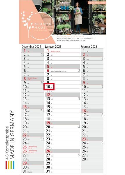 Individuelle Termine übersichtlich planen: Spectrum 3 als 3-Monats-Streifenkalender mit einem einsprachigen Kalendarium. | Format: 300 x 600 mm | Kalendarium: Deutsch 1sprachig hellgrau | Ausstattung: Datumsschieber rot | Werbefläche: am Kopf | Werbung: 4C-Druck inklusive