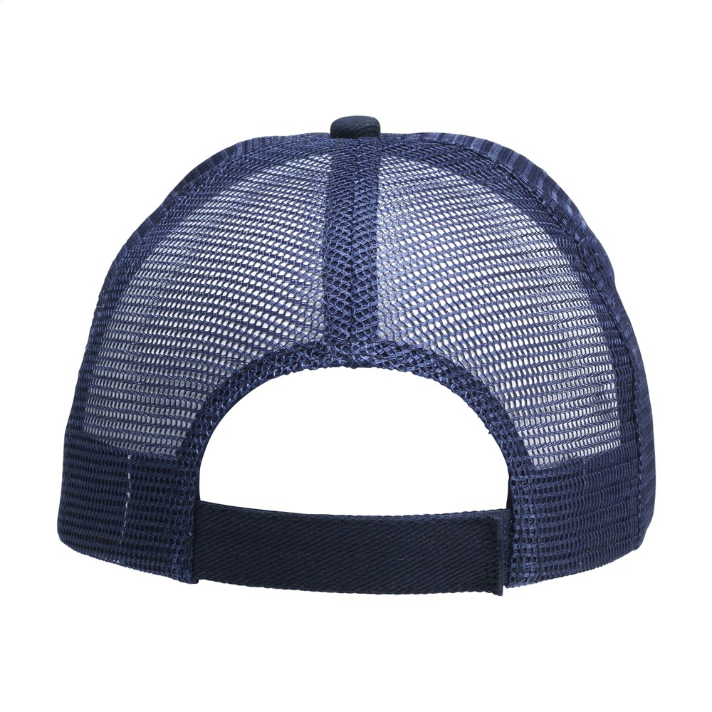 WoW! Trucker-Kappe mit 5 Panels mit vorgeformtem, gebogenem Schirm aus 60% gebürsteter, recycelter Baumwolle und 40% recyceltes Polyester. Rückseite aus Mesh-Struktur (Polyester) für optimale Belüftung. Mit Klettverschluss.