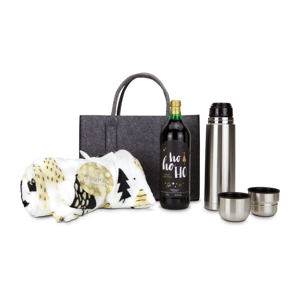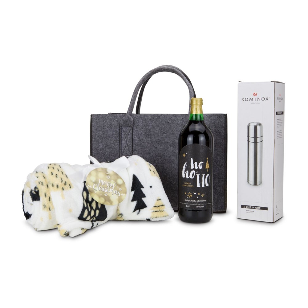 Gemütliche Winterabende in einer praktischen Filztasche verpackt. Hier erhalten Sie eine Flasche Glühwein (1 l), eine passende ROMINOX® Isolierkanne (750 ml) mit clever integriertem Zweitbecher im Deckel sowie die Kuscheldecke Merry Christmas (120 x 150 cm, STANDARD 100 von OEKO-TEX®). Die Decke wird schnell zum kuscheligen Begleiter für die kalte Jahreszeit, während Sie die Tasche aus veganem Filz aus 100% recyceltem PET (zertifiziert nach Global Recycling Standard; ca. 36 x 20 x 25 cm) als praktischen Begleiter das ganze Jahr über nutzen können.