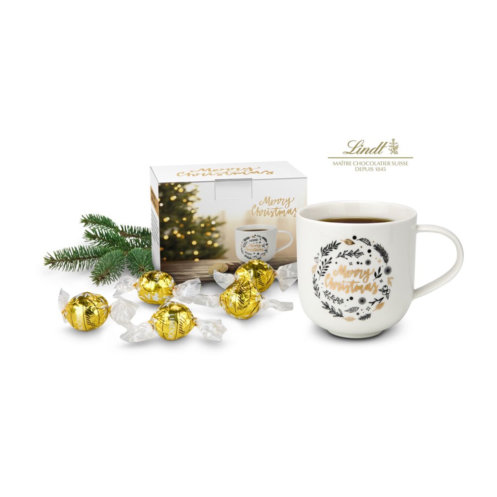 Diese edle Tasse möchte man nach Weihnachten gar nicht wegräumen. Der stimmungsvolle Porzellanbecher (350 ml) ist beidseitig bedruckt mit goldener „Merry Christmas“ Aufschrift und kommt gefüllt mit 5 goldgewickelten Lindt Lindorkugeln zum Naschen (je 12,5 g). Ein wunderschöner Begleiter, welcher schnell zur „Lieblingstasse“ in der Advents- und Weihnachtszeit wird, egal ob zu Hause oder im Büro.