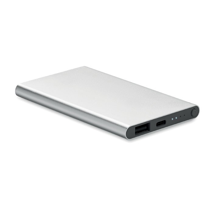 Powerbank 4000 mAh. Gehäuse aus recyceltem Aluminium. Ausgangsstrom DC5V/2A. Inklusive Kontrollleuchte und USB-Kabel mit Typ-C. Eingang/Ausgang: Typ- C.