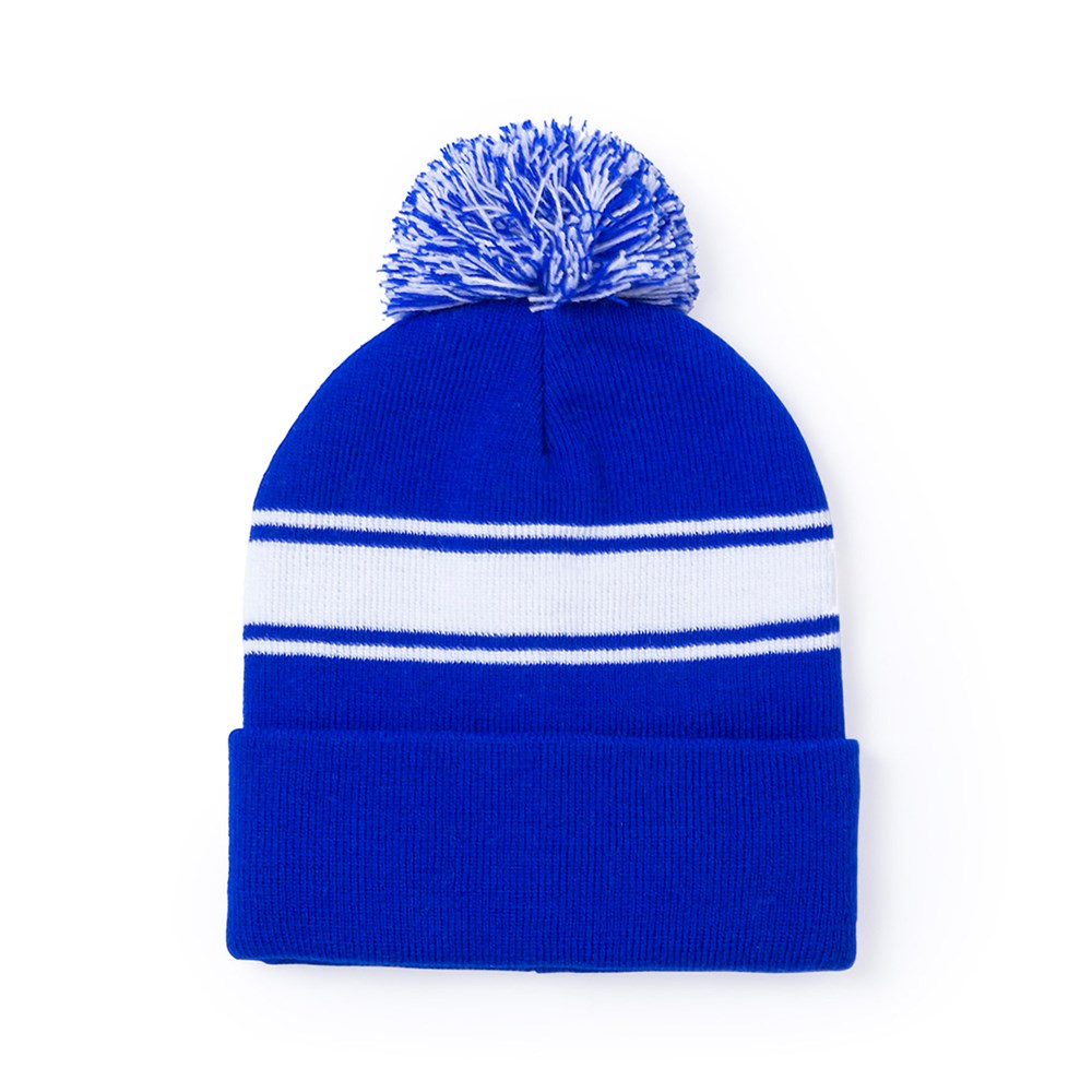 Weiche und warme Mütze aus Acryl in einer Vielzahl von Farben. Mit originellem Design, weißem Streifen und farblich passendem, zweifarbigem Bommel.