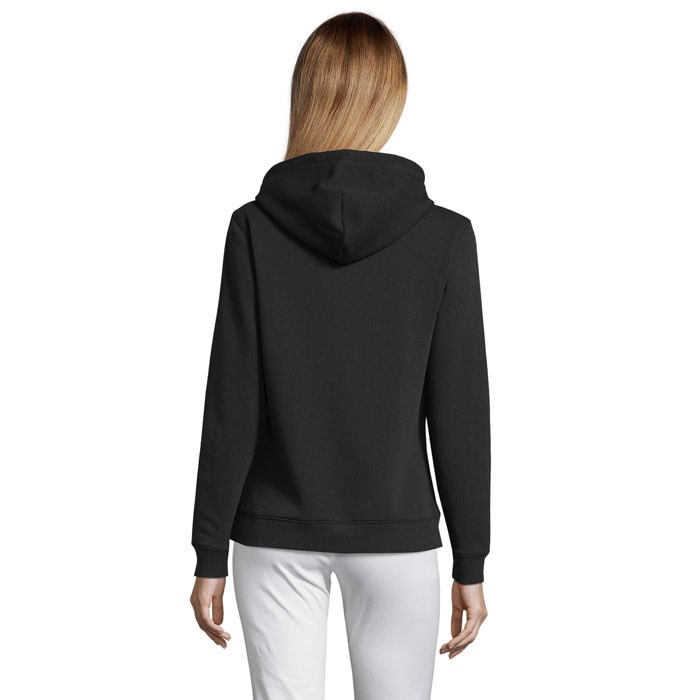 SOL'S SPENCER Damen Sweater 280g. Kängurutasche. Seitennähte. Gefütterte Kapuze mit Zugband. Feinrippeinfassung an Ärmelbündchen und Saum 2x2. Halbmondpasse auf der Krageninnenseite. Nackenband auf der Krageninnenseite. Material: 80% Baumwolle Ringspun - 20% Polyester. Innen angeraut. Außenmaterial 100% Baumwolle. OEKO-TEX®. Verkauf nur inklusive Werbeanbringung.
