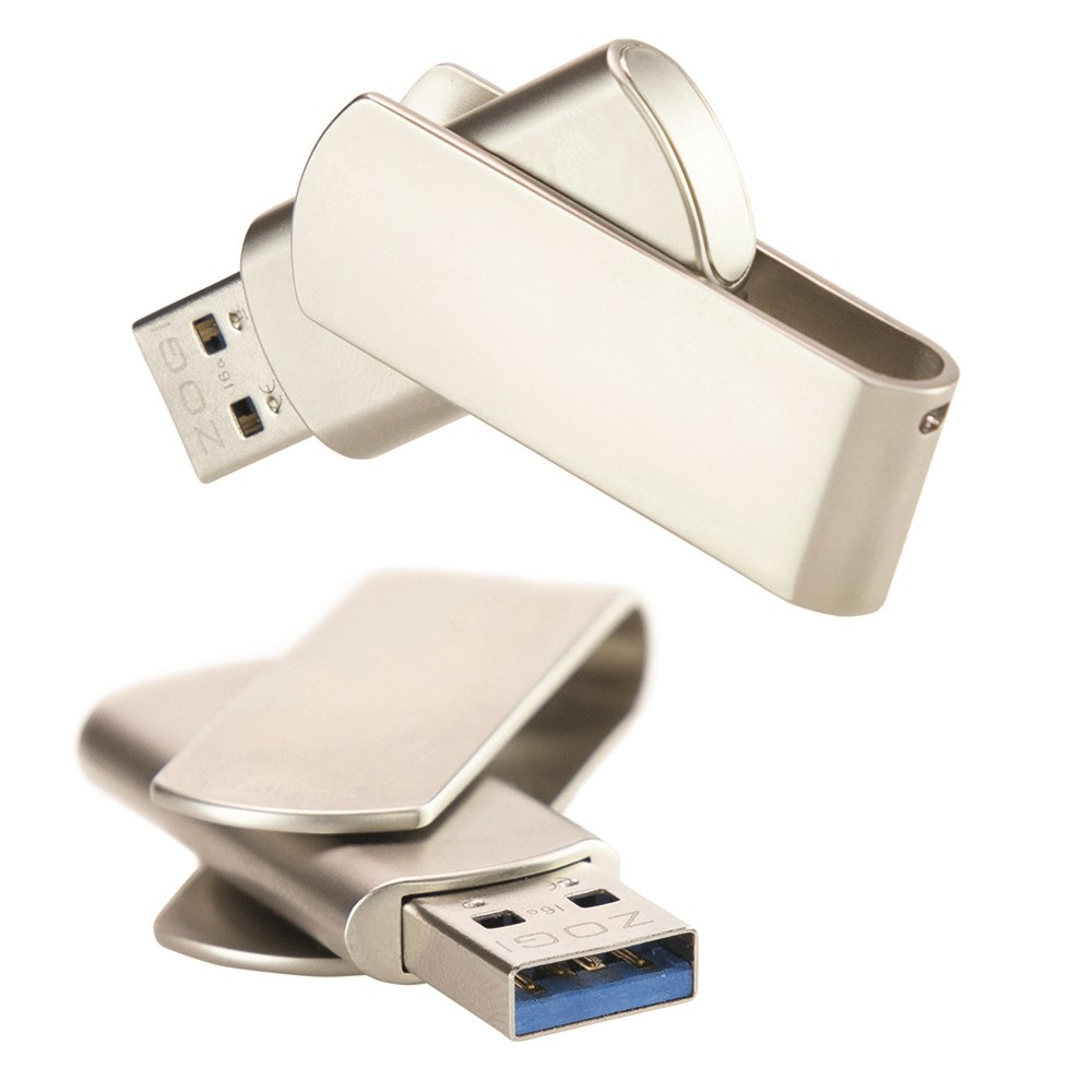 Hochwertig verarbeiteter USB-Stick mit robustem Metallgehäuse und drehbarem Bügel. Individuell mit zeitloser Lasergravur und Wunschkapazität von 1 bis 64 GB.