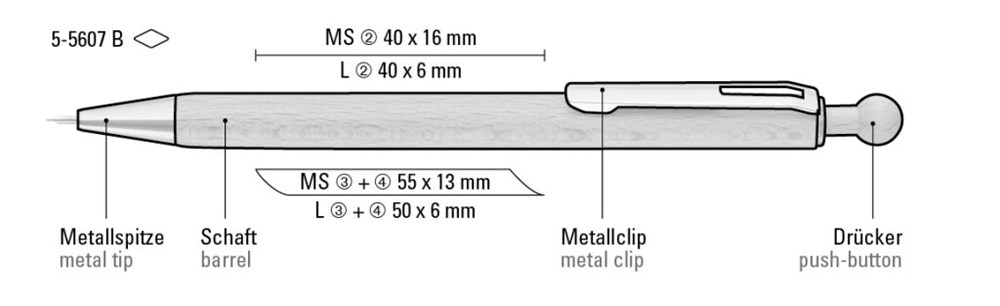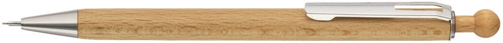 Holz-Druckbleistift (0,7mm) mit Holz-Kugeldrücker, Metallclip und Metallspitze silber glänzend. Schaft und Drücker aus schutzlackiertem PEFC-zertifiziertem Buchenholz.