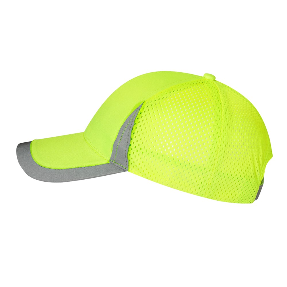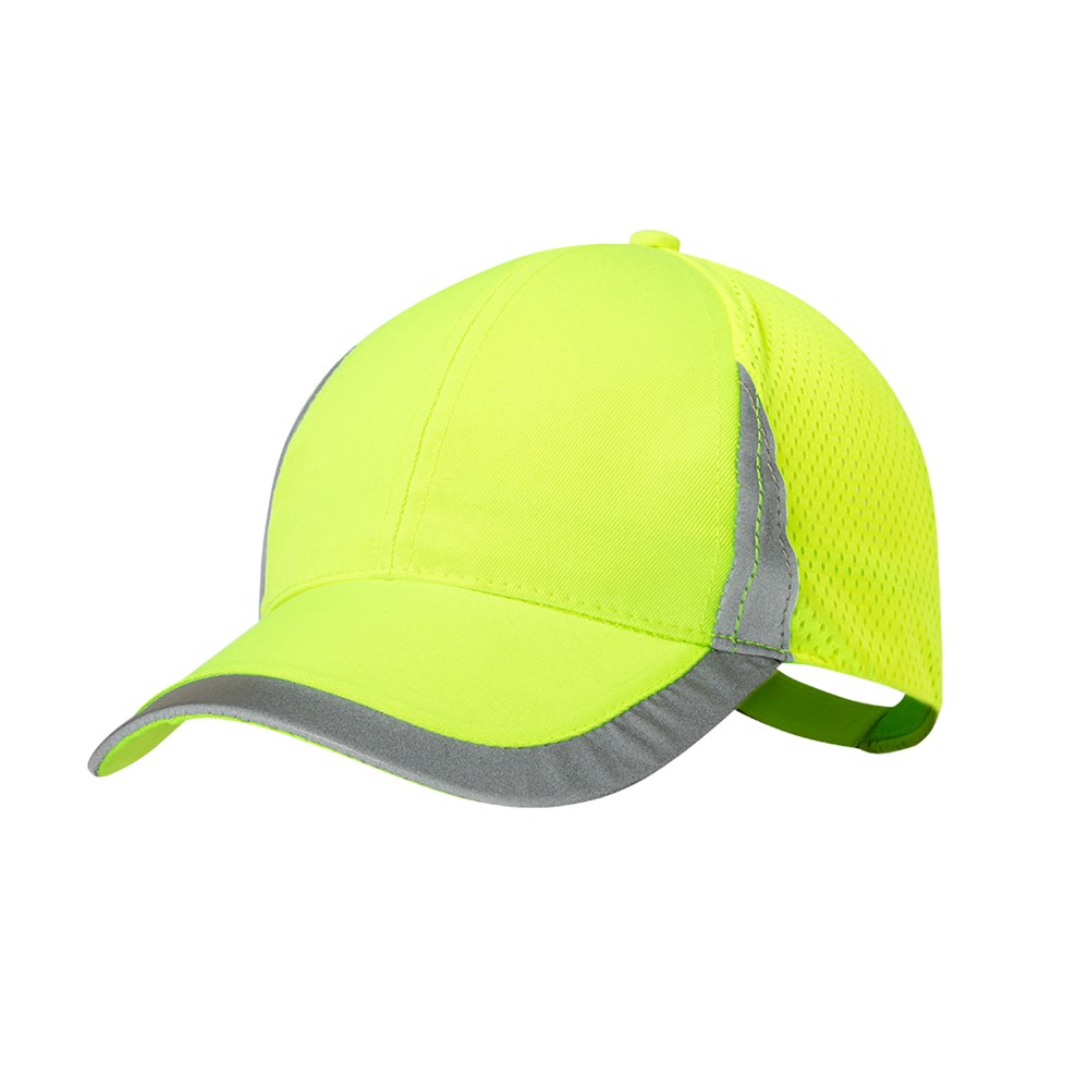 Sportmütze aus weichem Polyester. Verstellbarer Klettverschluss und atmungsaktiver Netzrücken. In fluoreszierendem Gelb mit reflektierenden Details an Schirm, Front und Verschluss.