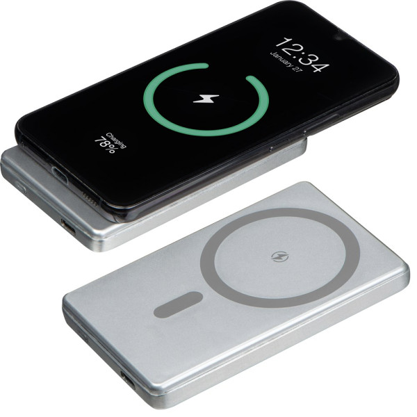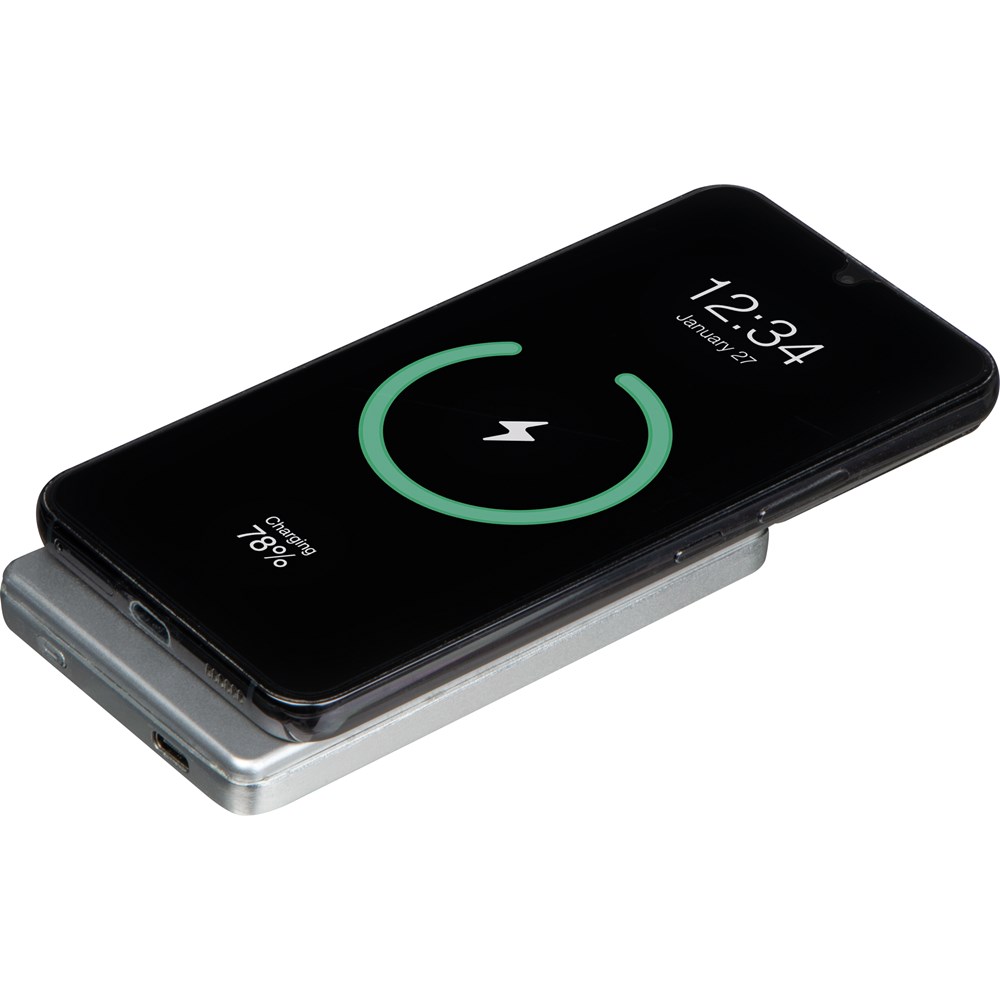 Magnetisches Ladegerät aus recyceltem Aluminium mit 5.000 mAh Leistung für kabelloses Laden bis zu 10 Watt. Durch den integrierten Magneten dockt das Ladegerät am Iphone® an und sorgt für schnelles und kabelloses Laden. Kompatibel ab Iphone® 12, bei anderen QI-fähigen Modellen kann sie als Wireless Charger verwendet werden. Ihre Werbung gravieren wir auf der Rückseite.