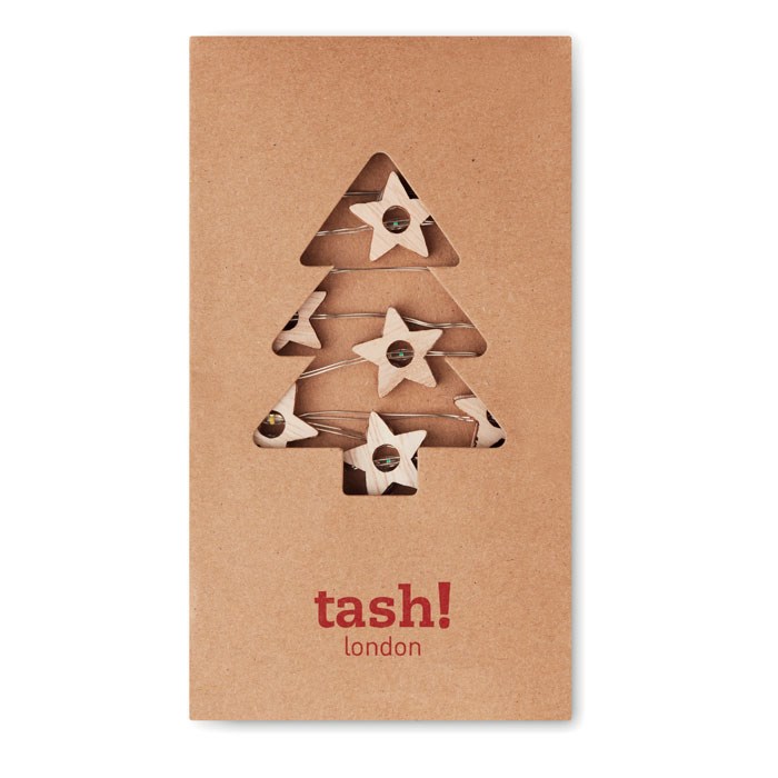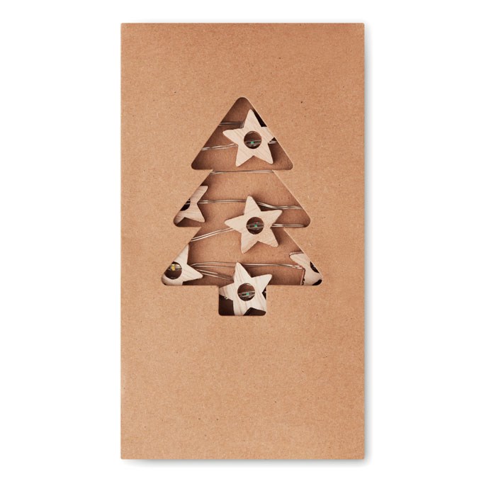 Lichterstrang mit Holzsternen und 20 LED-Lichtern. Der Ein/Ausschalter befindet sich im Batteriefach. Verpackt im kleinen Karton. Exkl. 2 AA Batterien.