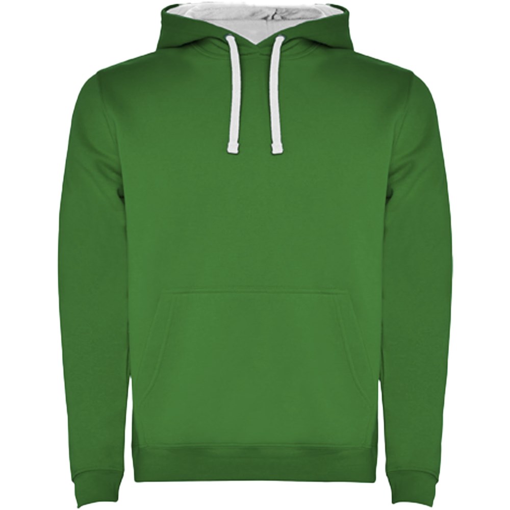 Kapuzenpullover mit doppeltem Stoff, verstellbarem Kordelzug in Kontrastfarbe, verstärkten und verdeckten Nähten am Kragen und Kängurutasche. Verfügbar in Zweifarbig und Uni. Elastischer 1×1-Rippstrick an Ärmeln und Bund. Abnehmbares Etikett. Das Modell ist 185 cm groß und trägt Größe M.