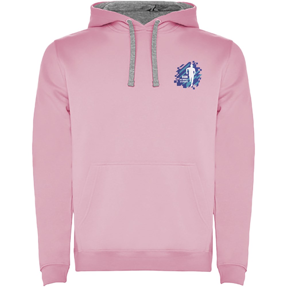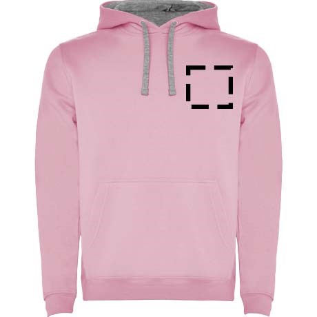 Kapuzenpullover mit doppeltem Stoff, verstellbarem Kordelzug in Kontrastfarbe, verstärkten und verdeckten Nähten am Kragen und Kängurutasche. Verfügbar in Zweifarbig und Uni. Elastischer 1×1-Rippstrick an Ärmeln und Bund. Abnehmbares Etikett. Das Modell ist 185 cm groß und trägt Größe M.