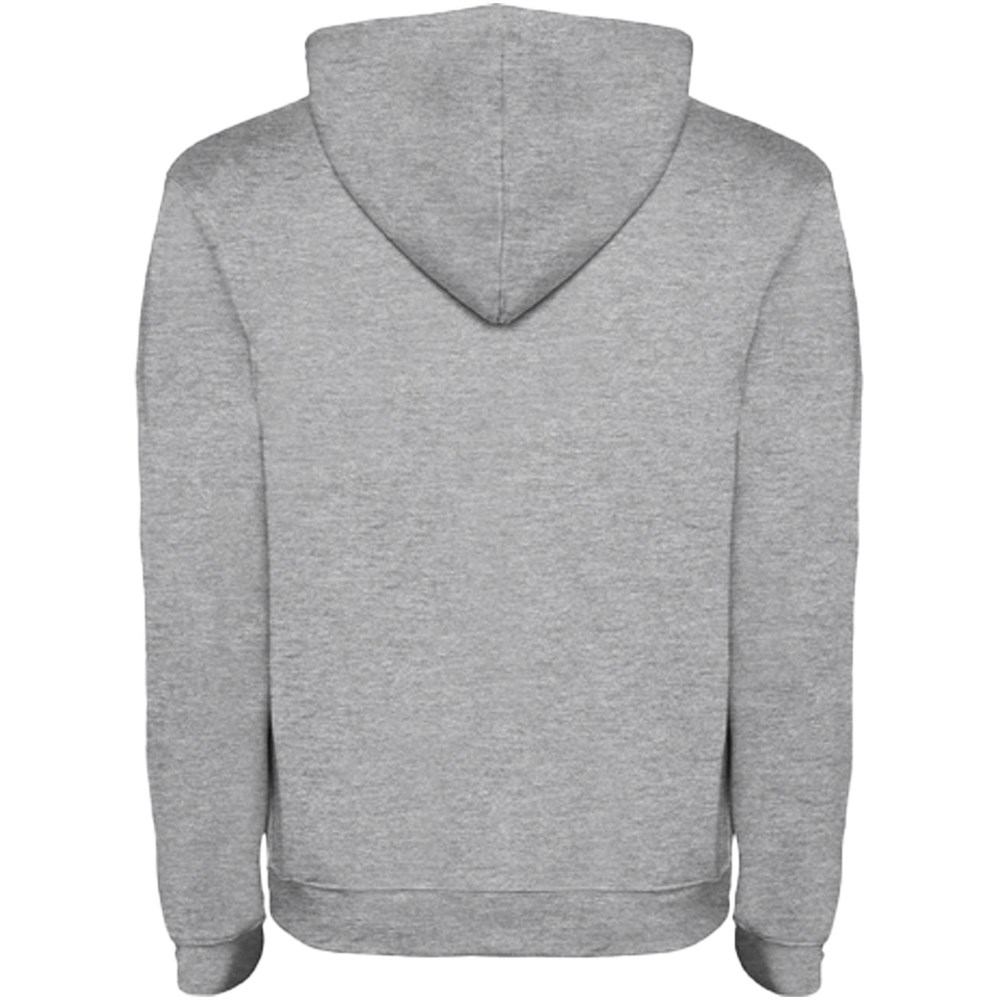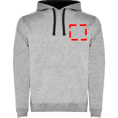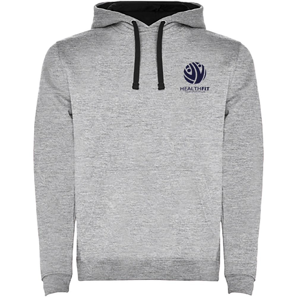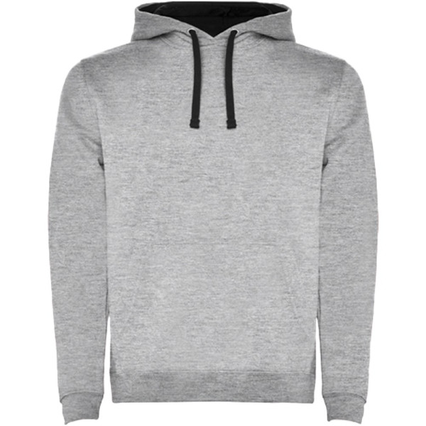 Kapuzenpullover mit doppeltem Stoff, verstellbarem Kordelzug in Kontrastfarbe, verstärkten und verdeckten Nähten am Kragen und Kängurutasche. Verfügbar in Zweifarbig und Uni. Elastischer 1×1-Rippstrick an Ärmeln und Bund. Abnehmbares Etikett. Das Modell ist 185 cm groß und trägt Größe M.