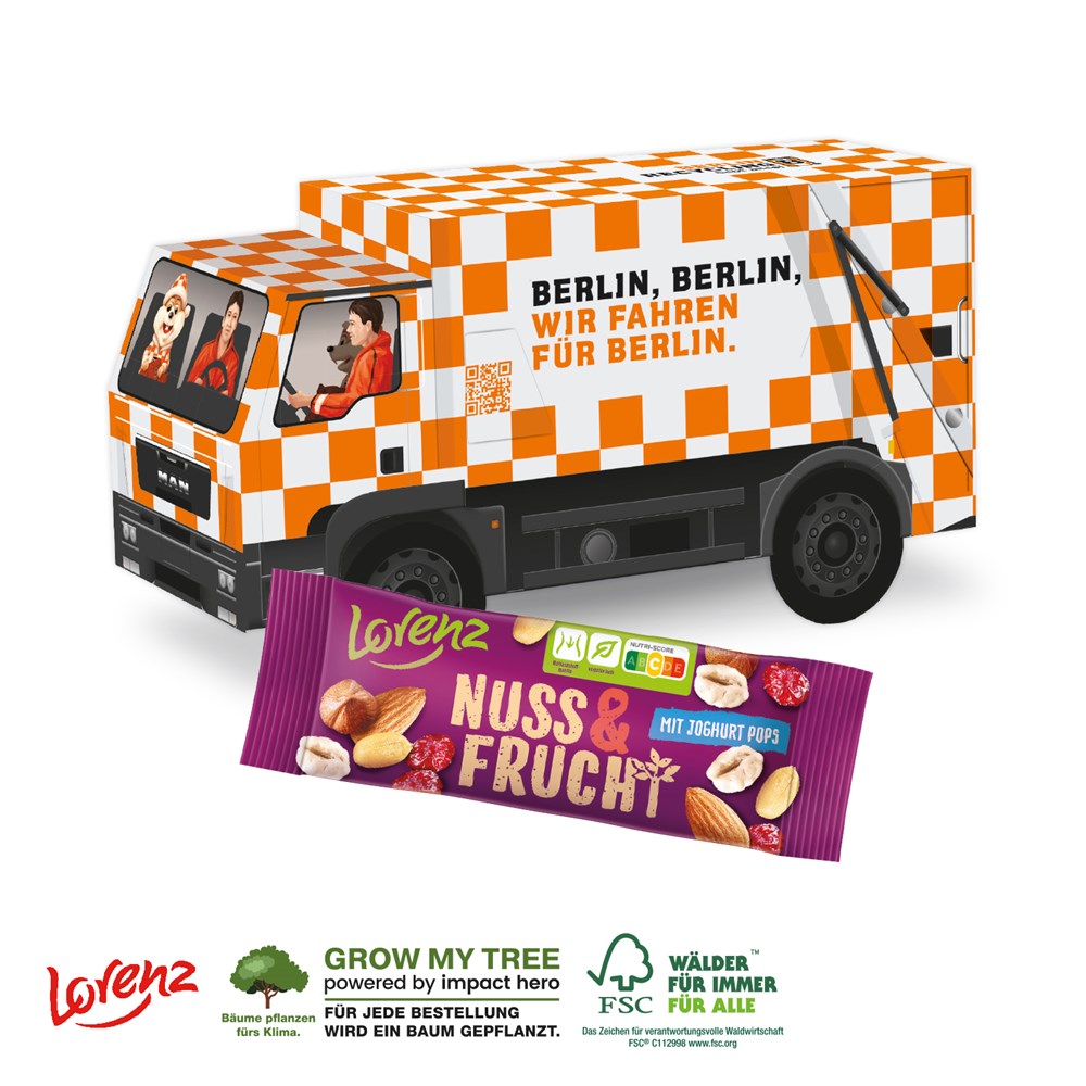 Perfekt für die Logistik! Individuell bedruckbares Präsent als „LKW“ mit vielen Gestaltungsmöglichkeiten. Wählen Sie aus verschiedenen Varianten feinster Markenfüllungen.. Produktdetails: Individuelle Präsentverpackung aus hochwertiger Kartonage mit süßer Füllung.. Nachhaltigkeit: Für jede Bestellung mit uns wird ein Baum über GROW MY TREE gepflanzt. Wir verwenden FSC® zertifizierten Karton aus nachhaltiger Forstwirtschaft und anderen kontrollierten Quellen.