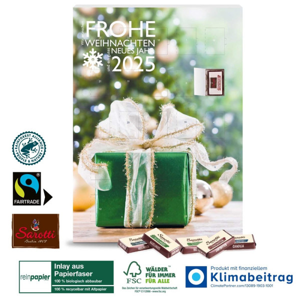 Nachhaltigkeits-Champion! Leckere Fairtrade-Schokolade in vier Geschmacksrichtungen versüßt Ihren Kunden, Kundinnen und Ihrem Team die Weihnachtszeit. Das papierbasierte Inlay ist biologisch abbaubar und im Altpapier recycelbar. Produktdetails: Wand-Adventskalender mit Aufhängeloch und Tischaufsteller. Gleich mitbestellen: Einzelversandkarton für den Postversand. Nachhaltigkeit: Produkt mit finanziellem Klimabeitrag, auf FSC®-zertifiziertem Karton aus nachhaltiger Forstwirtschaft und anderen kontrollierten Quellen. Durch den Kauf von Fairtrade®-zertifiziertem Kakao unterstützen Sie den nachhaltigen Kakao-Anbau. Inlay 100 % biobasiert, aus nachwachsenden Rohstoffen hergestellt, biologisch abbaubar und kompostierbar nach DIN EN 13432. 100 % recycelbar, Entsorgung zusammen mit Altpapier