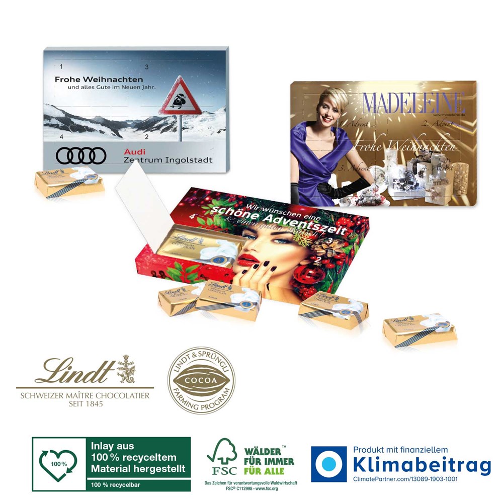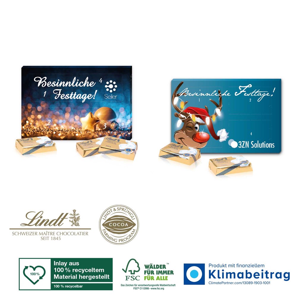 Der vermutlich kleinste Schoko-Kalender der Welt! Erst eins, dann zwei, dann drei, dann vier! Trendiger Adventskalender mit je einer süßen Überraschung für die vier Adventssonntage. Ideal auch als „Lastminute-Kalender“ oder „X-MAS-Reminder“. Produktdetails: Schokoladen-Adventskalender in hochwertiger Vollkartonhülle im Querformat. Nachhaltigkeit: Produkt mit finanziellem Klimabeitrag, auf FSC®-zertifiziertem Karton aus nachhaltiger Forstwirtschaft und anderen kontrollierten Quellen. Das Lindt & Sprüngli Farming-Programm steht für nachhaltige Kakaobohnen-Beschaffung (www.farming-program.com). Inlay aus 100 % recyceltem Material hergestellt (z.B. aus recycelten Getränkeflaschen). 100 % recycelbar