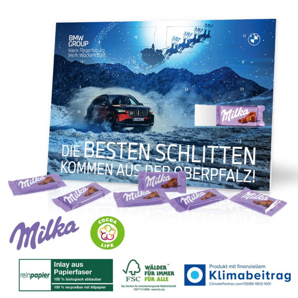 Beliebter und nachhaltiger Klassiker! Der Milka Adventskalender mit feinster Alpenmilchschokolade ist ein echter Klassiker und schwer beliebt. Rundum individuell bedruckt ist dieser Adventskalender ein ideales Werbemittel für die Weihnachtszeit. Das Inlay ist aus 100 % nachwachsenden Rohstoffen hergestellt, 100 % biologisch abbaubar und kann mit dem Altpapier recycelt werden. Produktdetails: Schokoladen-Adventskalender in hochwertiger Vollkartonhülle im Querformat, mit praktischem Tischaufsteller zum Ausklappen. Gleich mitbestellen: Einzelversandkarton für den Postversand. Gleich mitbestellen: Einzelversandkarton für den Postversand. Nachhaltigkeit: Produkt mit finanziellem Klimabeitrag, auf FSC®-zertifiziertem Karton aus nachhaltiger Forstwirtschaft und anderen kontrollierten Quellen. Cocoa Life ist ein ganzheitliches Programm für nachhaltigen Kakao, mit dem letztendlichen Ziel, den gesamten Kakaobedarf aus nachhaltigem Anbau zu beziehen (www.cocoalife.org). Inlay 100 % biobasiert, aus nachwachsenden Rohstoffen hergestellt, biologisch abbaubar und kompostierbar nach DIN EN 13432. 100 % recycelbar, Entsorgung zusammen mit Altpapier
