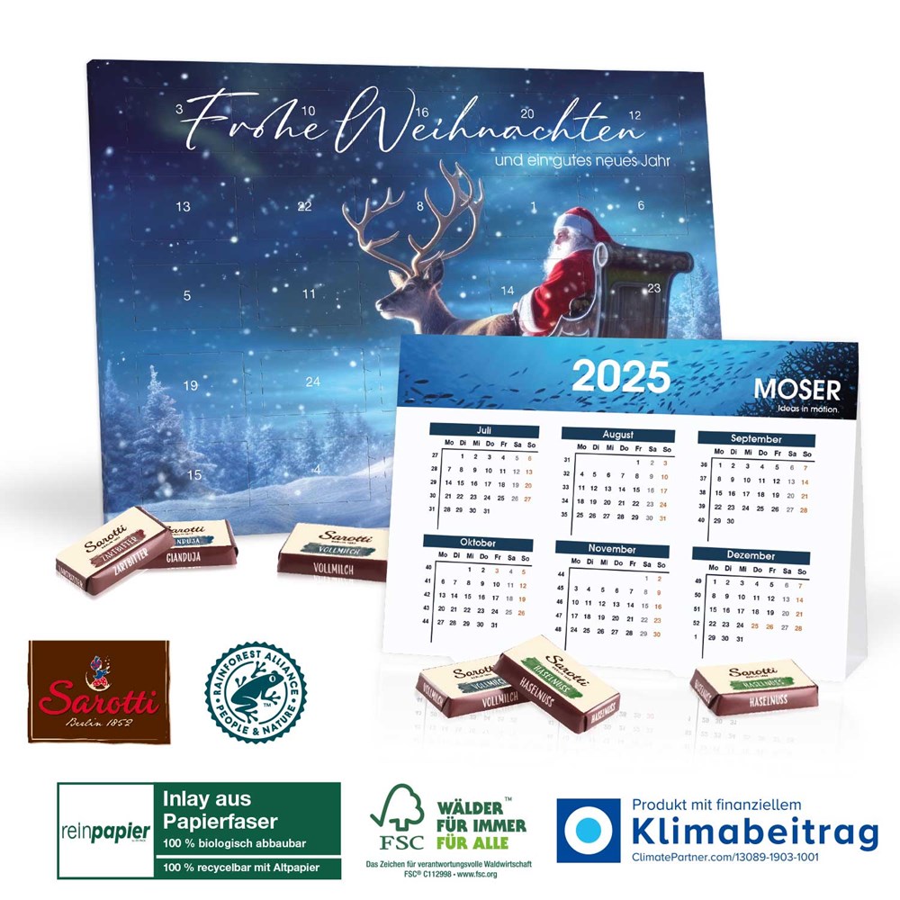 Langzeit-Werbewirkung garantiert! Mit dem beliebten „2 in 1“ Adventskalender bleiben Sie lange in guter Erinnerung! Feinste Markenschokolade lässt keine Wünsche offen. Der schöne Jahreskalender als Tischaufsteller kann ebenso wie der Adventskalender individuell bedruckt werden. Ein idealer personalisierter Adventskalender für Kunden und Mitarbeiter. Produktdetails: Tisch-Adventskalender in hochwertiger Vollkartonhülle im Querformat, inklusive Jahresplaner zum Aufstellen. Adventskalender und Jahresplaner zusammen in Aromaschutzverpackung (recycelbar, Materialdichte reduziert). Gleich mitbestellen: Einzelversandkarton für den Postversand. Nachhaltigkeit: Produkt mit finanziellem Klimabeitrag, auf FSC®-zertifiziertem Karton aus nachhaltiger Forstwirtschaft und anderen kontrollierten Quellen. Inlay 100 % biobasiert, aus nachwachsenden Rohstoffen hergestellt, biologisch abbaubar und kompostierbar nach DIN EN 13432. 100 % recycelbar, Entsorgung zusammen mit Altpapier
