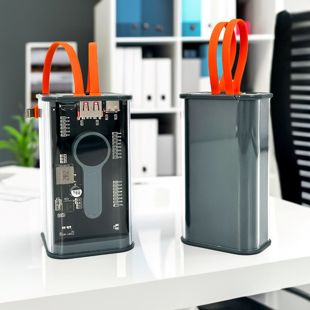 Diese leistungsstarke Powerbank verbindet mit ihrer beeindruckenden 20.000mAh Akkukapazität Zuverlässigkeit und Stil, ermöglicht mehrfache Ladungen für mobile Geräte und unterstützt Fast-Charging, um Geräte schnell wieder einsatzbereit zu machen. Sie ist mit Typ-C und Lightning-Anschlüssen sowie integrierten Kabeln ausgestattet, was sie besonders benutzerfreundlich macht. Ihr elegantes, glasähnliches Aussehen dient nicht nur der Ästhetik, sondern bietet auch ideale Flächen für individuelle Veredelung durch Druck oder Gravur, was sie zu einem idealen Werbemittel oder exklusiven Geschenk macht. Die Kombination aus Funktionalität und Design macht sie zu einem unverzichtbaren Begleiter im Alltag.