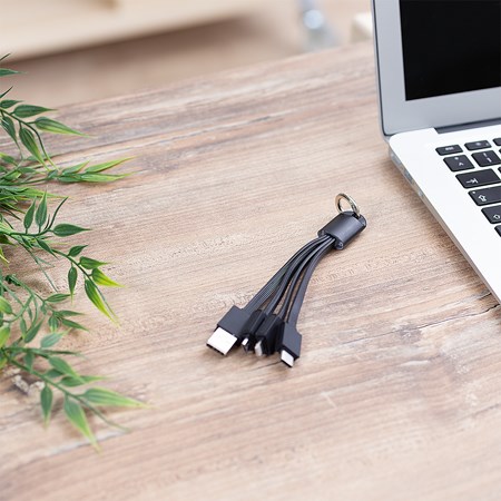 Das 4 in 1 Ladekabel Glow vereint praktische Ladekapazitäten mit einer effektiven Werbemöglichkeit durch beleuchtete Logo-Präsentation. Es ist aus langlebigem Silikongummi und Kunststoff gefertigt, verfügt über vier verschiedene Anschlüsse (USB, Micro, iOS, Type C) und ermöglicht somit das zeitgleiche Laden mehrerer Geräte. Dank eines stabilen Keyrings lässt sich das Kabel leicht transportieren und ist immer zur Hand. Als Werbegeschenk in einem ansprechenden PVC-Bag verpackt, stellt es eine ideale Option für Messen und Kundenveranstaltungen dar, wobei Ihr Markenlogo mittels Lasergravur eindrucksvoll zum Leuchten gebracht wird.