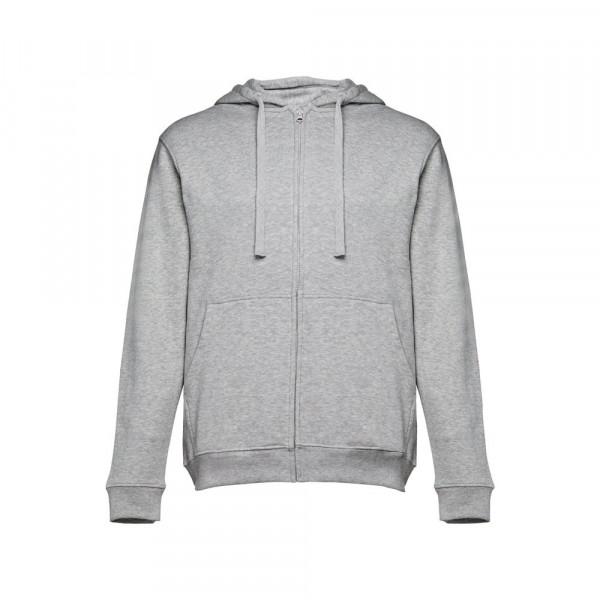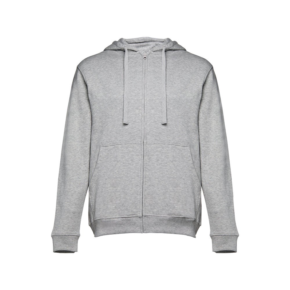 Herren Sweatjacke aus 50% Baumwolle und 50% Polyester (320g/m²) mit Reißverschluss und gefütterter Kapuze mit Kordelzug. Kardiert mit 2 Kängurutaschen, einem verdeckten Kunststoffreißverschluss und einem gerripten Bund. Größen: S, M, L, XL, XXL