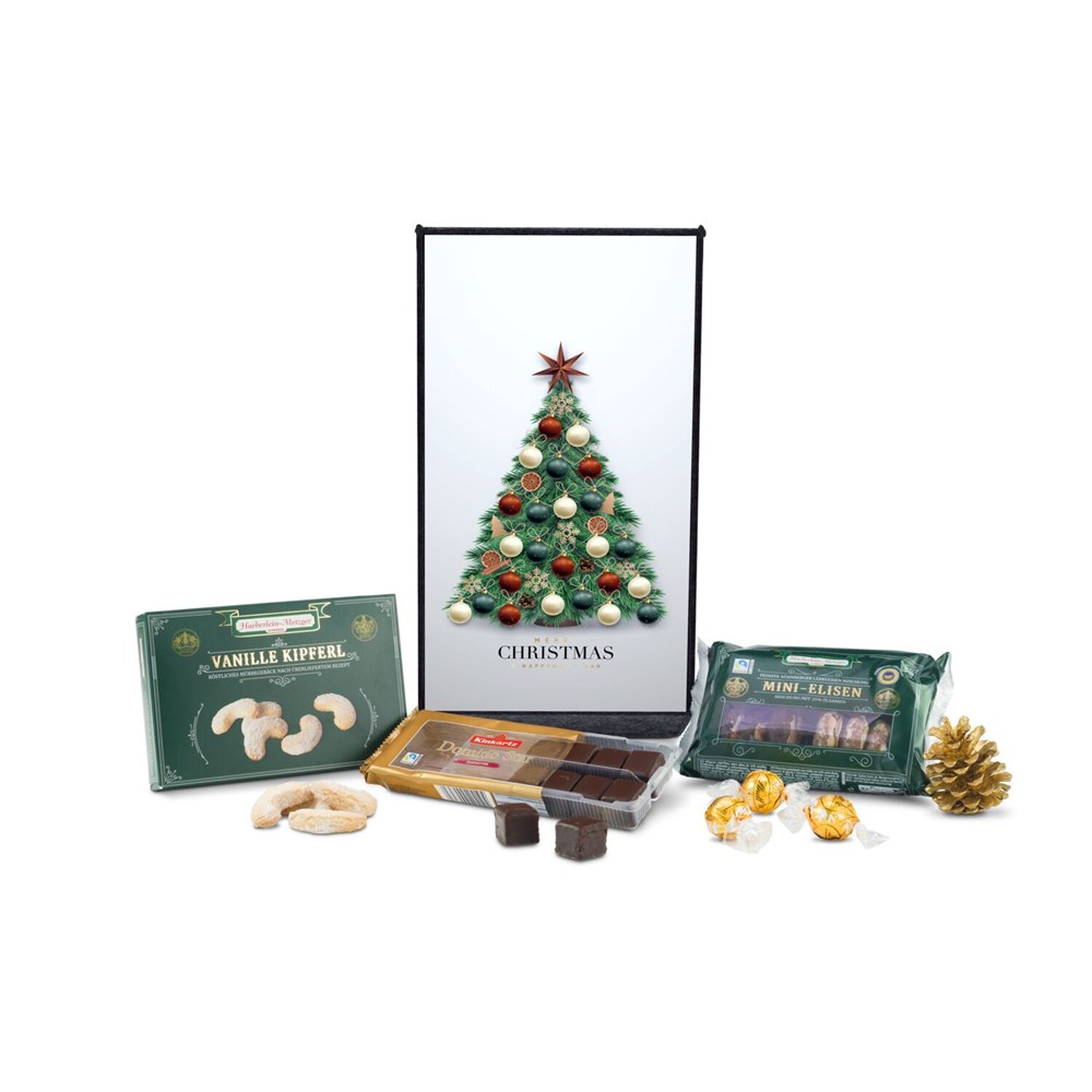 Weihnachten für alle Sinne. Dieser exklusive ROMINOX® Filz-Geschenkkorb (veganes Filz aus 100% recyceltem PET zertifiziert nach Global Recycling Standard) mit farblich abgestimmtem Motiveinleger ist reichlich gefüllt mit weihnachtlichen Klassikern: 16 feine Mini-Elisen Lebkuchen (200 g, schokoliert und glasiert), 10 saftige Dominosteine in Zartbitterschokolade (125 g), traditionelle Vanille Kipferl (100 g) und 3 goldene Lindt Lindorkugeln mit weißer Schokolade (37,5 g). Auch fürs Auge ein Genuss. Und nach Weihnachten kann der Filzkorb als dekorative Ablage oder Staufach nachhaltig im Einsatz bleiben. Auf Wunsch auch mit individuellem Einleger.