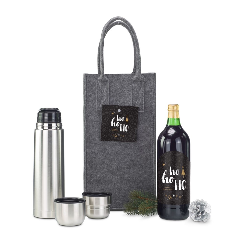 Eine stilvolle Kombination zur Weihnachtszeit: ein leckerer Glühpunsch (1 l, alkoholfrei) und eine moderne Isolierkanne mit zwei Bechern in einer praktischen ROMINOX® Tragetasche. Bei unserem alkoholfreien Glühpunsch in der klassischen 1 Liter Krugflasche mit "HoHoHo"-Etikett kommen Sie auch ohne Alkohol in den wunderbaren Genuss eines köstlichen, wärmenden Weihnachts- bzw. Wintergetränks in der kalten Jahreszeit. Hergestellt wird der Punsch aus Traubensaft und Wasser und geschmacklich abgerundet durch Aromen von Nelken, Zimt, Piment, Zitronen, Orangen, Heidelbeeren, Macis, Kardamom und Anis. Einfach nur erhitzen und schon können Sie den Punsch genießen oder für unterwegs in die ROMINOX® Isolierkanne gießen. Die Kanne aus Edelstahl (750 ml) hat einen praktischem Drehverschluss mit Drucköffnung und einen clever integrierten Zweitbecher. Beides kommt in einer hübschen ROMINOX® Filztasche in modern meliertem Grauton (veganes Filz aus 100% recyceltem PET zertifiziert nach Global Recycling Standard) mit weihnachtlichem Anhänger, welche auch später noch als praktische Tragetasche nachhaltig im Einsatz bleibt. Auf Wunsch auch mit individuellem Anhänger.