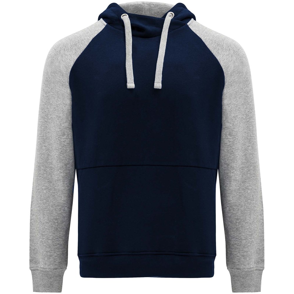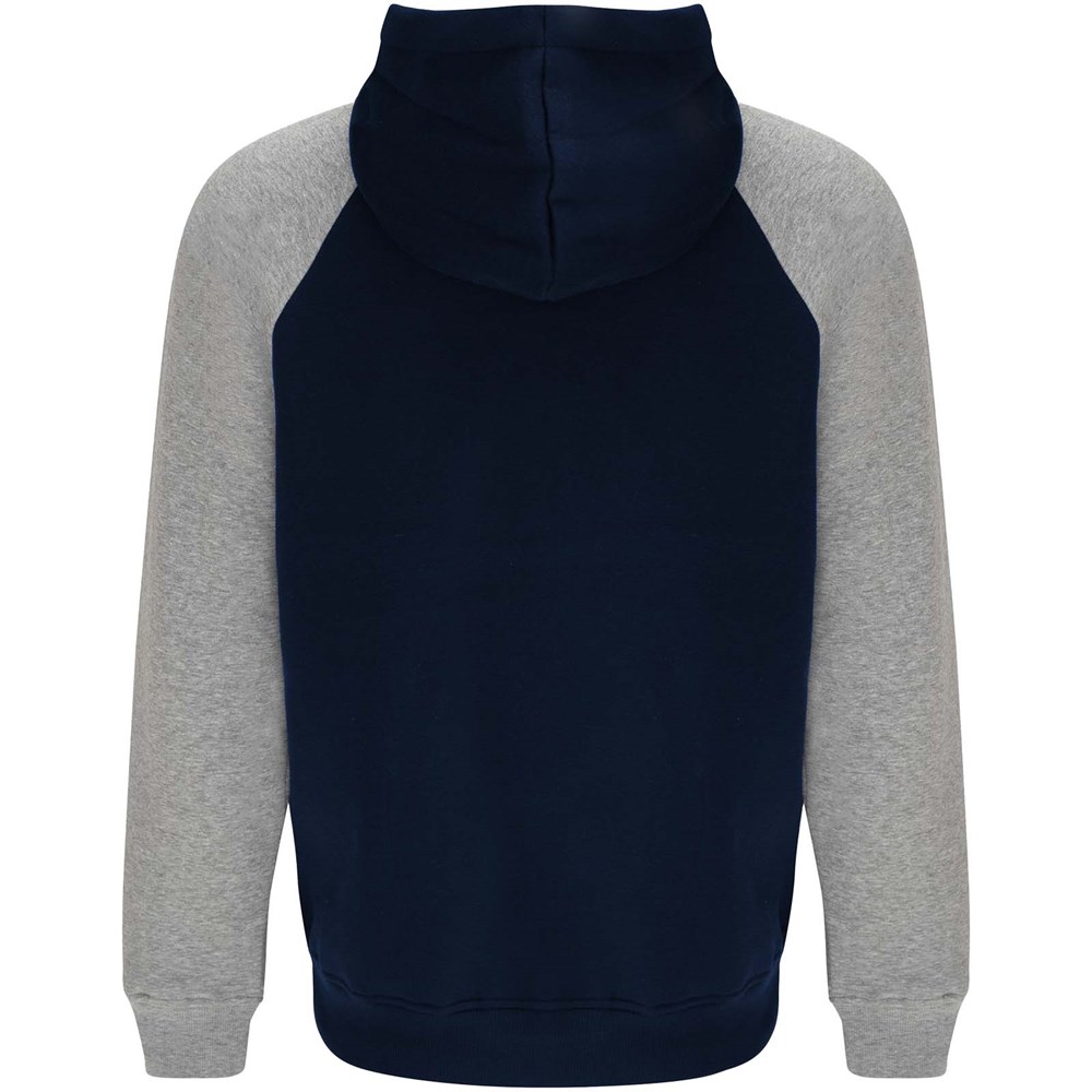 Zweifarbiger Unisex Kapuzenpulli. Kapuze mit gekreuztem Kragen und Metallösen. Innenkapuze, Kordelzug und Raglanärmel in Kontrastfarbe. Kängurutasche. Bündchen und Saum aus elastischem 1×1-Rippstrick. Abnehmbares Etikett.