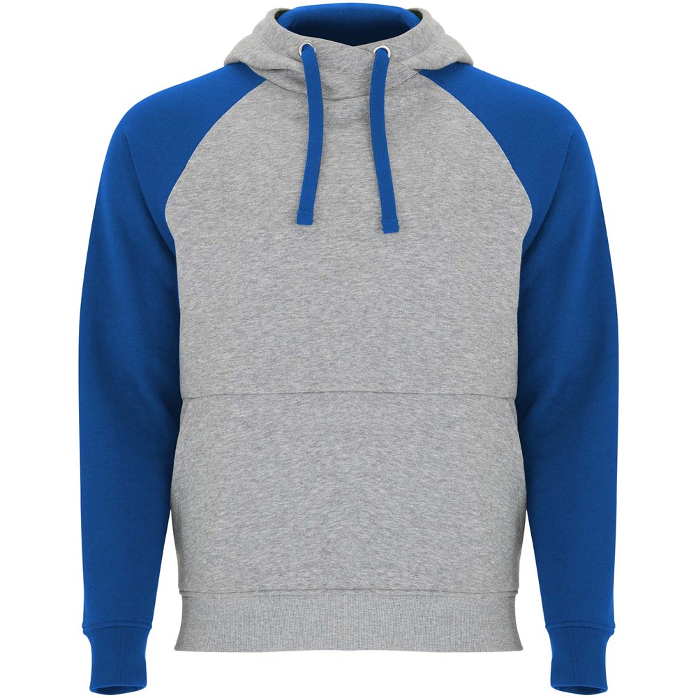 Zweifarbiger Unisex Kapuzenpulli. Kapuze mit gekreuztem Kragen und Metallösen. Innenkapuze, Kordelzug und Raglanärmel in Kontrastfarbe. Kängurutasche. Bündchen und Saum aus elastischem 1×1-Rippstrick. Abnehmbares Etikett.