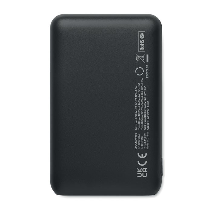 Powerbank 5000 mAh aus recyceltem ABS. Geeignet zum Betrieb von Smartphones. Ausgang: 1 x Typ-C, 2 x Typ-A & 1 x Typ-B. Eingang: 2-in-1 Typ C & Typ-A.