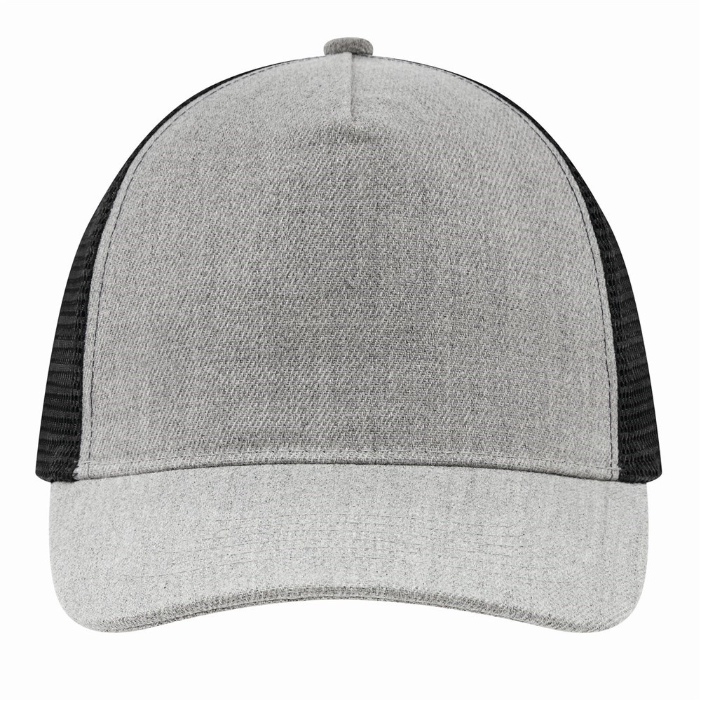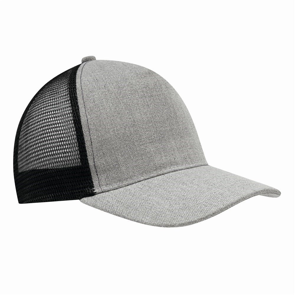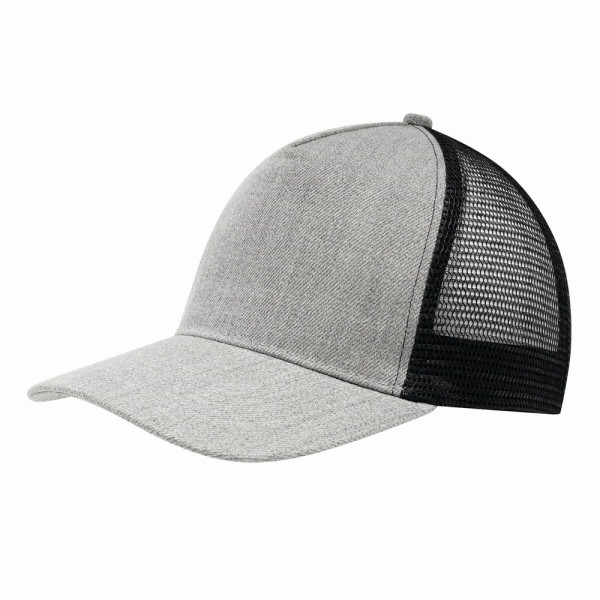 5-Panel-Cap CASUAL FIT, 2-farbig: verstärktes, meliertes Frontsegment, übrige Segmente aus Netzstoff, größenverstellbarer, doppelreihiger Kunststoffverschluss am Hinterkopf