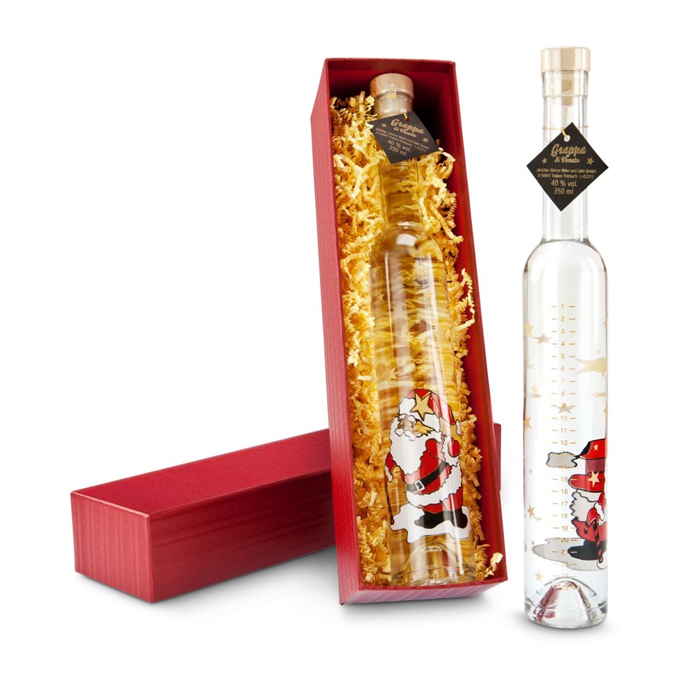 Adventskalender für Erwachsene: Die Flasche mit Skala für jeden der 24 Tage im Advent ist gefüllt mit 350 ml italienischem Grappa. Sie liegt in einem eleganten roten Schmuckkarton mit cremefarbenem Sizzle.