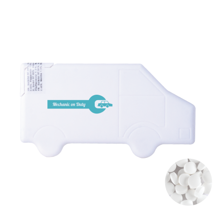 LKW Mintdispenser 88x40 mm mit ca. 8 gr. Minties zuckerfrei und Zutatenaufkleber, TAMPONDRUCK, Verfügbar in weiß.