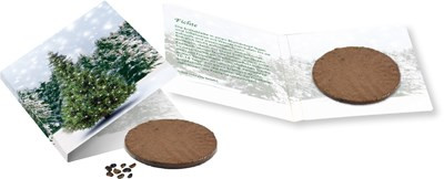 Dieses Kärtchen beinhaltet alles für die Anzucht eines eigenen Weihnachtsbaumes. Eine Erdtablette und der Fichtensamen sind beigelegt. Die Pflanzanleitung ist auf der Innenseite des Kärtchens aufgedruckt. Platz für den Werbedruck, ab 250 Stück auf dem Standardmotiv, ist auf der Vorderseite des Kärtchens. Eine eigene Gestaltung des Kärtchens ist ebenfalls bereits ab 250 Stück realisierbar. Inhalt: Erdtablette, Samen Fichte