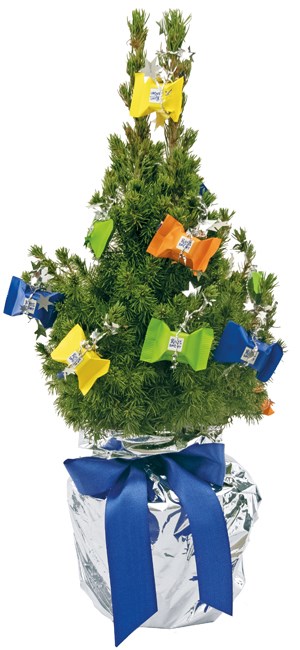 Eine lebende Zuckerhutfichte 35 - 45 cm, verpackt in einer Einzelversandkartonage, als kleiner Baum zu Weihnachten. Klassisch und dekorativ versetzt diese Zuckerhutfichte jeden Raum in eine weihnachtliche Stimmung. Das Bäumchen kann auf Wunsch von uns direkt an einzelne Empfänger versendet werden. Geschmückt ist das Bäumchen mit 24 Stück Ritter Sport Würfeln. Deko für den Topf: Topffolie silber, Schleife rot. Die Farben der Schleifen (rot, orange, blau, gold, silber) und Topffolien (gold, silber, Jute, Naturpapier) sind beliebig kombinierbar. Der Werbedruck erfolgt auf einer separaten Grußkarte aus unserem Sortiment oder auf einer Beilage nach Wunsch.