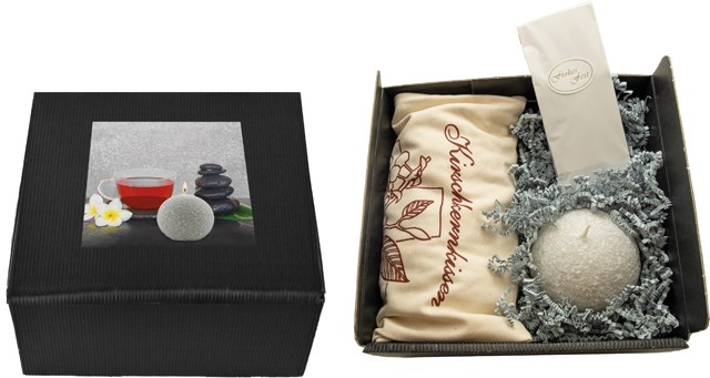 Entspannung und Wärme, das können Ihre Kunden mit unserem Winter-Wellness-Set genießen. Das Kirschkernkissen bietet eine lang anhaltende Wärme, der Tee und die Kerze Behaglichkeit. Der Natur-Baumwollstoff kann ab 100 Stück bedruckt werden. Weitere Stoff-Farben (rot, grün, blau, gelb, weiß) und andere Abmessungen sind möglich. Eine separate Karte aus unserem Sortiment oder Ihre gewünschte Beilage dienen als Werbeträger.