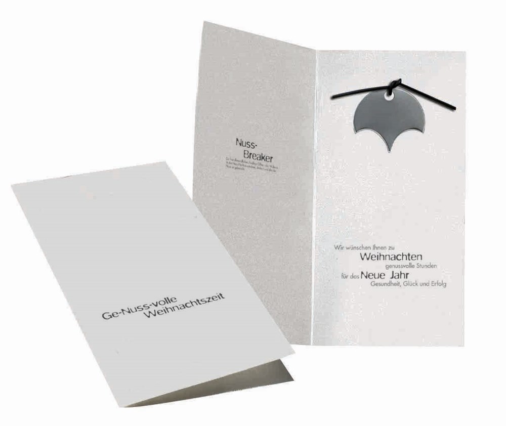 Diese edle Weihnachtskarte enthält einen Edelstahl-Nussbreaker, der in der Winterzeit immer wieder zum Einsatz kommt (ohne Nuss). Platz für den Werbedruck ist auf dem Standardmotiv der Karte oder eine eigene Gestaltung, jeweils ab 250 Stück. Ein Kuvert ist separat erhältlich Art. 6101.