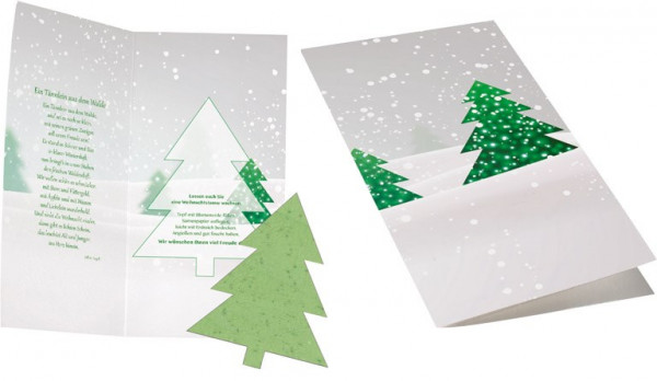 Der Tannenbaum enthält bereits Fichtensamen. Einfach auf das Erdreich legen, mit etwas Erde bedecken und gießen. Schon nach wenigen Tagen sprießen die ersten Keimlinge. Ab 250 Stück ist Ihre Werbebotschaft auf dem Standardmotiv oder die individuelle Gestaltung der Karte möglich. Ein Kuvert ist separat erhältlich, Artikel 6101 Inhalt: Samenpapier Fichte (ca. 98 x 124 mm)