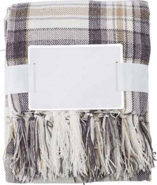 Decke aus 100% Polyester (600 gr/m²), kariert, mit Fransen auf der kurzen Seite und dank des Chenillegarns besonders weich. Die Decke wird zusammengefaltet mit einem Label für die Werbeanbringung geliefert.