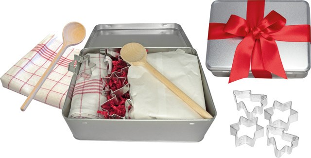 Inhalt: 500 g Backmischung, Geschirrtuch, Rührlöffel, 2 Ausstechformen Stern, je ca. 5 cm und 2 Ausstechformen Tannenbaum, je ca. 5 cm