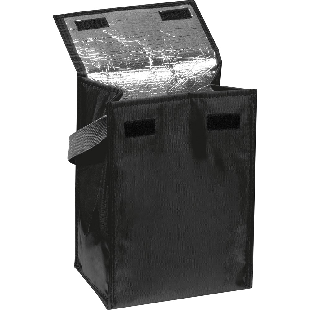 Einfache Kühltasche aus Polyester mit islioerndem Innenteil und Klettverschlüssen zum Verschließen. Passend für 4 Flaschen je 0,5 Liter. Ihre Werbung wird auf eine Seite gedruckt.