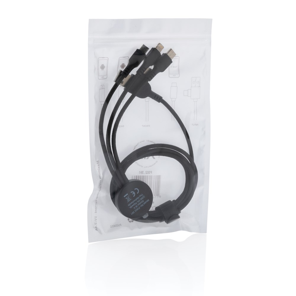 Nylonumwobenes Multikabel mit 5 verschiedenen Anschlüßen: Type-C-in, USB-A-in, Type-C-out, iOS-out und Micro-USB-out. Auf diese Weise können Sie das Kabel auch mit Type-C Ausgängen verwenden, die in der neueren Generation von Telefonen und MacBook-Computern enthalten sind. Das Kabel verfügt außerdem über eine USB A-Output-Input-Funktion, mit der jedes Gerät von jeder Ausgangsquelle aufgeladen werden kann. Das Gehäuse aus ABS kann graviert werden, damit Ihr Logo beleuchtet wird, sobald das Kabel verwendet wird. PVC-frei. Kabellänge: 120 cm.