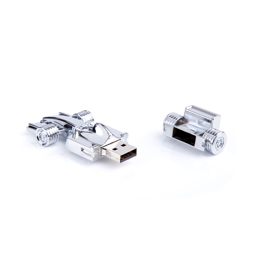Ausgefallener USB Stick in Form eines silbernen Rennwagens. Ein Accessoire für alle, die Autos lieben und ein schickes Design mögen.